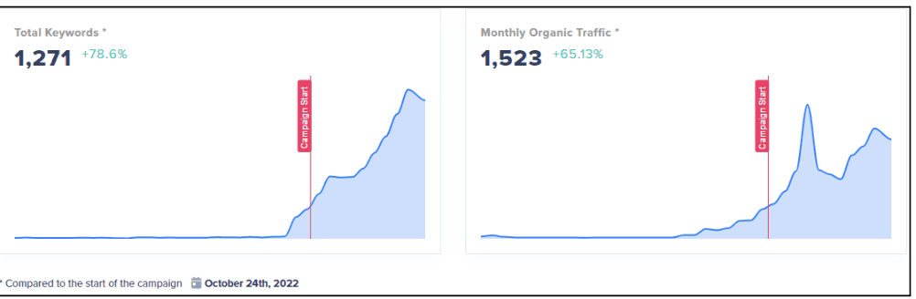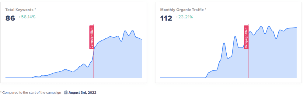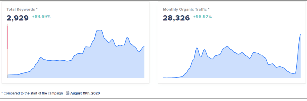 As you can see, the beginning of our campaigns aligns perfectly with this domain’s boosts in traffic and keyword rankings.