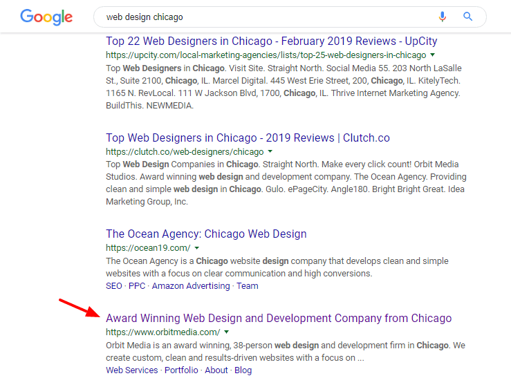 The high volume of inbound links has not only helped Orbit Media rank for many content-related searches, but also for its main money keywords including terms like “web design Chicago” and “web development Chicago”.