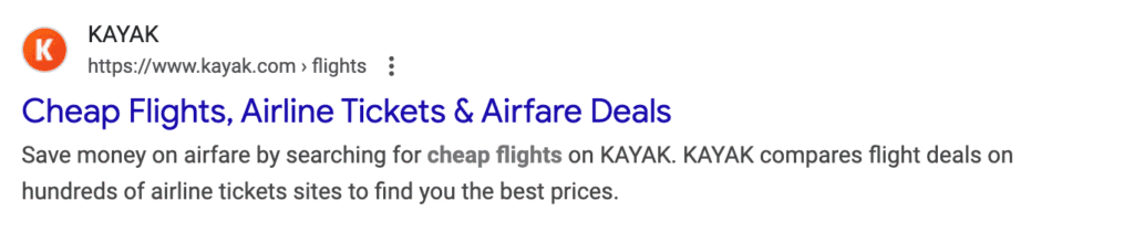 In this example, kayak.com used keywords that are commonly searched when looking for flights including brand names. They also mentioned related terms like "deals" and "best price" to give the searcher a reason to click the search result.