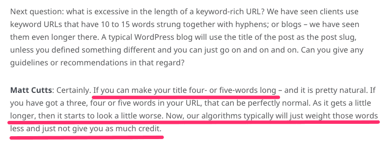 Google’s former head of search quality, Matt Cutts, stated in an interview that it’s important to keep URLs short:
